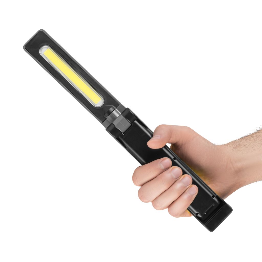 Mactronic FlexiBEAM verkstadslampa är en bärbar lampa för användning i industrianläggningar, verkstäder och byggarbetsplatser. Ett utmärkt tillskott för varje verktygslåda eller i din arbetsbil. Enheten designades med obegränsad mångsidighet i åtanke. Lampans huvud vilar på en roterande, hopfällbar arm. Det finns två krokar på baksidan av enheten. Lampans underdel har ett stativ och en magnet för att fästa den på metallytor. Den allsidiga designen garanterar mångsidighet och är perfekt för att belysa alla arbetsområden. Enheten genererar starkt ljus vid 600 lumen och en maximal räckvidd på 30 m. I ekonomiskt läge vid 280 lumen kan enheten arbeta kontinuerligt i 8 timmar. Det inbyggda batteriet kan laddas via medföljande usb kabel i ett USB-uttag i dess nedre del. Det tar ca 5 timmar att ladda batteriet helt.